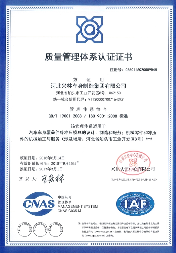 2017年3月1日,興林集團取得了ISO9001質量管理體系擴大范圍認證,這是興林集團在產品質量體系認證上又一次巨大突破。