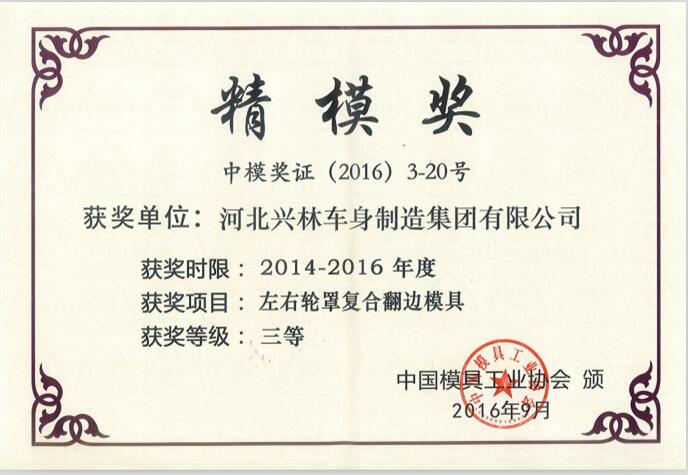 我公司于2016年6月28日至7月1日參加在上海新國際博覽中心舉行的第十六屆中國國際模具技術和設備展覽會,展會期間,中國模具工業協會繼續開展了兩年一度的“精模獎”評選活動,我公司憑借“左右輪罩復合翻遍模具”榮獲2014年~2016年度“精模獎”三等獎。