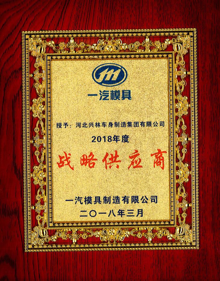 3月29日一汽模具制造有限公司2018年度供應鏈大會在吉林長春召開!會上,河北興林車身制造集團有限公司憑借優異的產品質量,被授予2018年度“戰略供應商”!河北興林車身制造集團有限公司 總經理葛總出席會議并領獎!