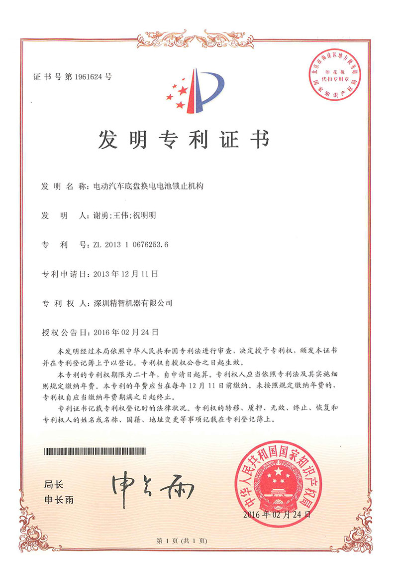 • 換電機(jī)器人與電池箱的掛接機(jī)構(gòu)-專利證書