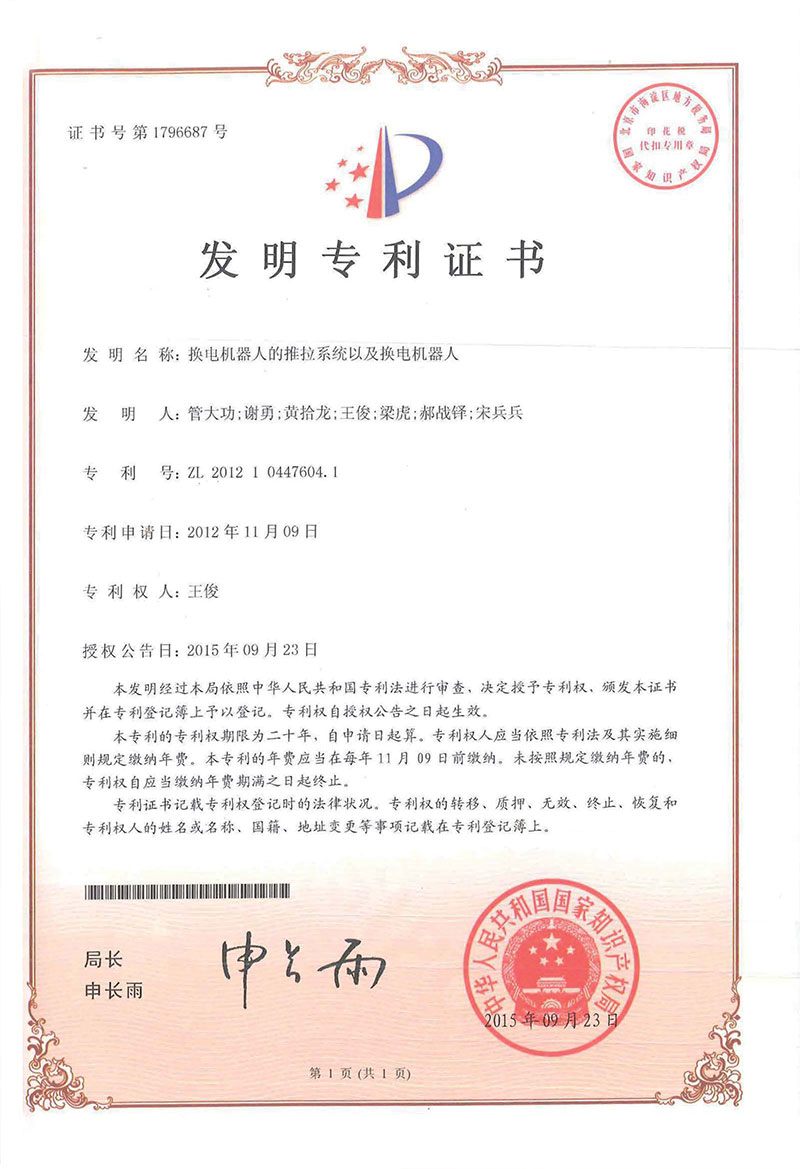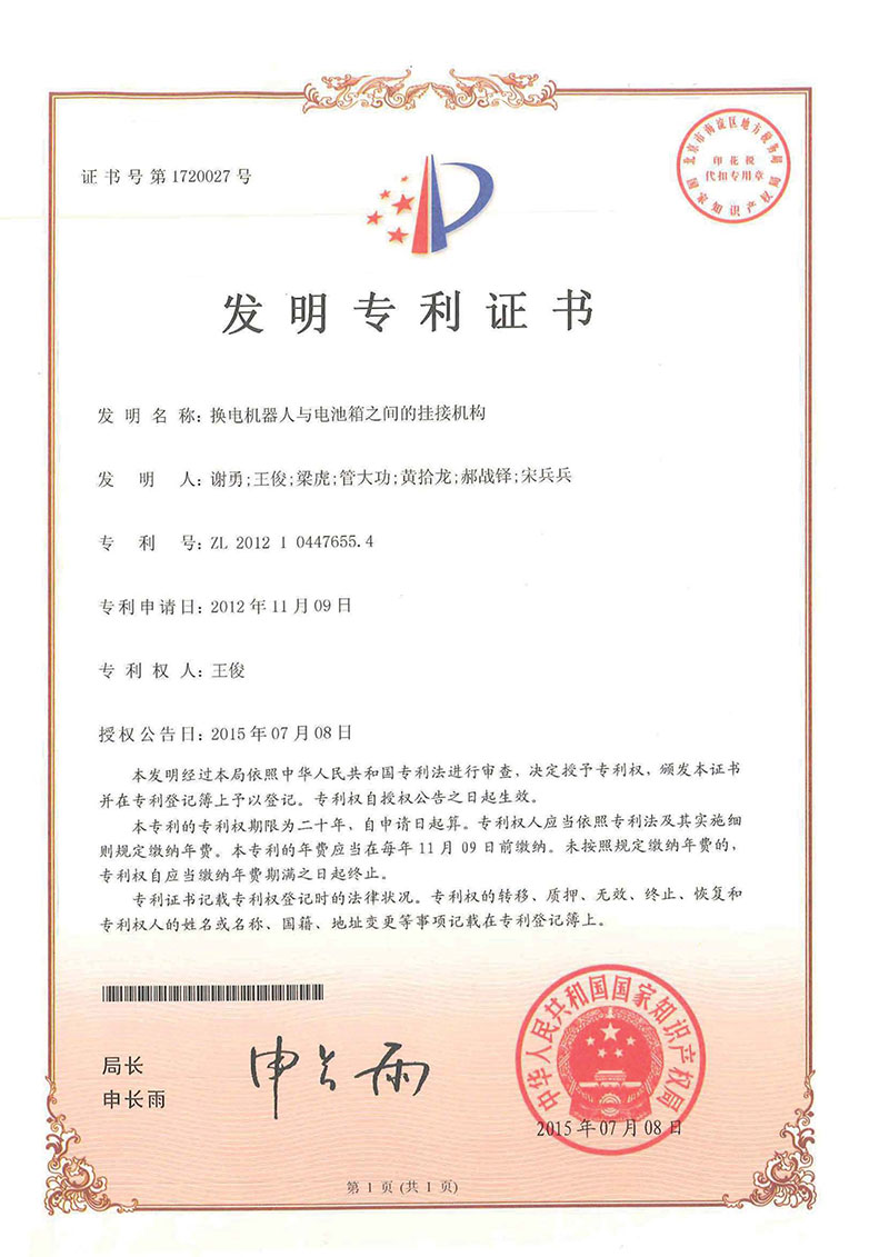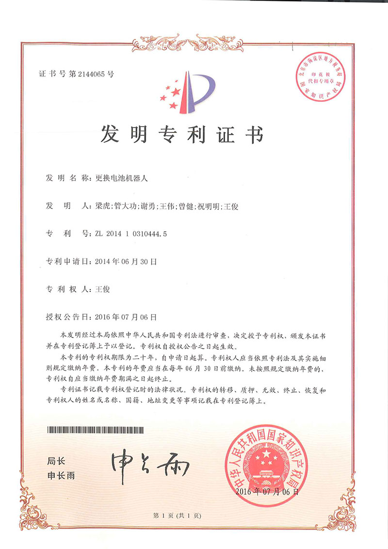 • 更換電池機(jī)器人-專利證書